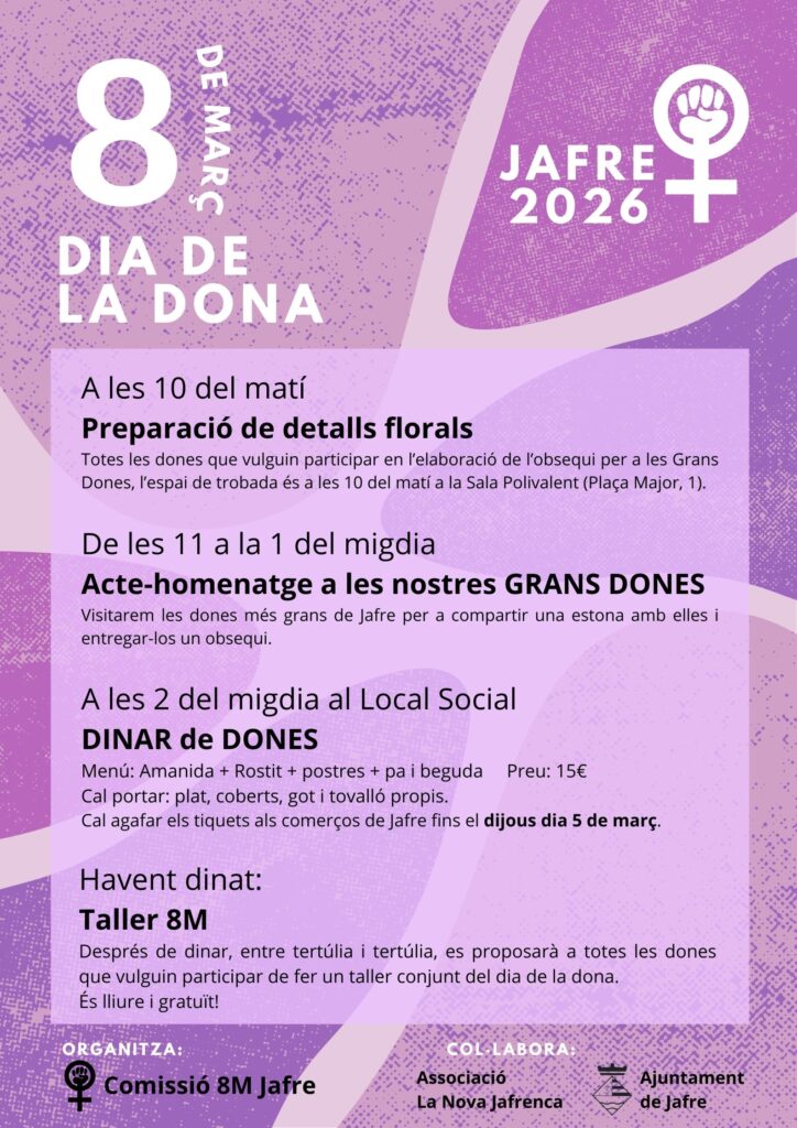 🍽️A les 2h del migdia: dinar de dones al Local Social. Cal agafar els tiquets a les botigues de Jafre fins el dijous 5 de març.
