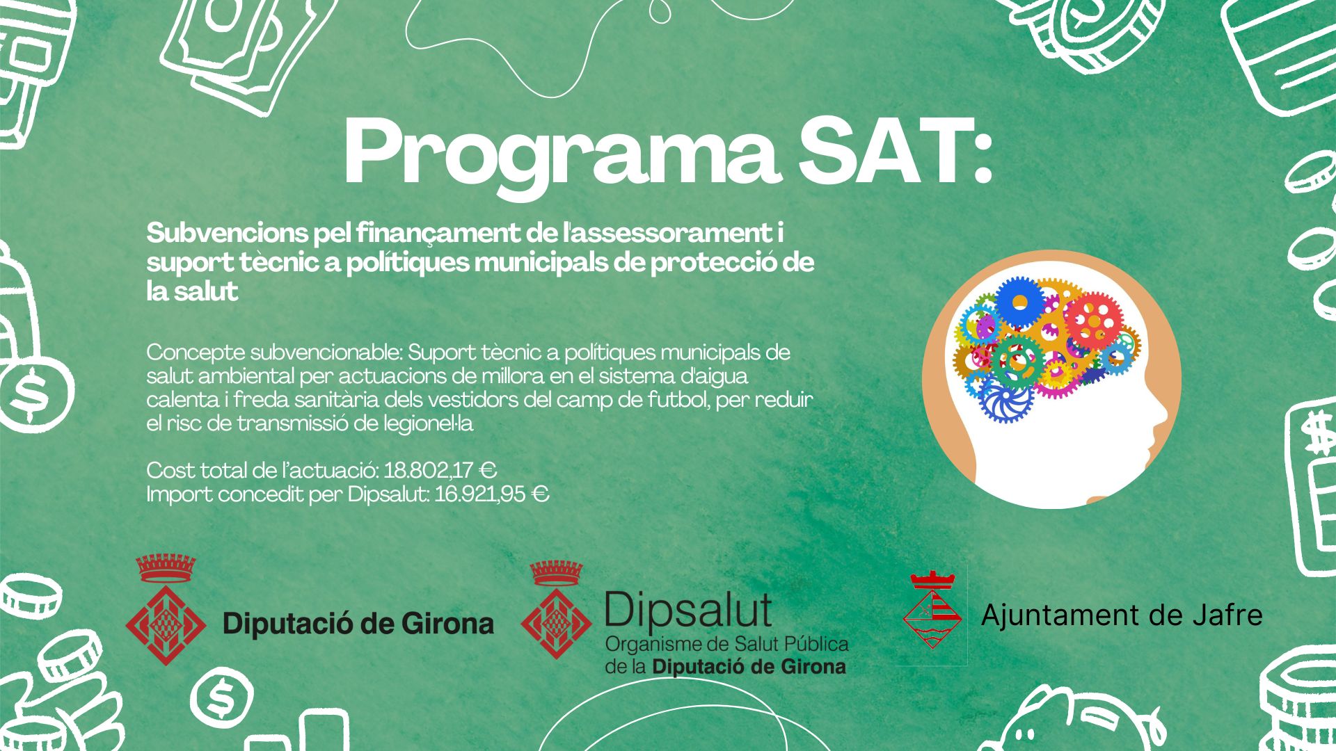 DIPSALUT – Organisme de Salut Pública de la Diputació de Girona Subvenció pel finançament de l’assessorament i suport tècnic a polítiques municipals de protecció de la salut (SAT), que serveix per actuacions de millora en el sistema d’aigua calenta i freda sanitària dels vestidors del camp de futbol, per reduir el risc de transmissió de legionel·la. Import concedit: 16.921,95€