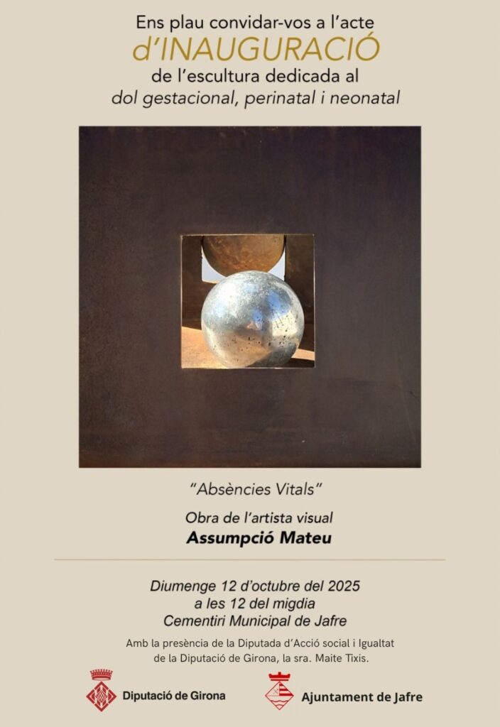 Ens plau convidar-vos el proper diumenge 12 d’octubre a les 12 del migdia a l’acte d’inauguració de l’escultura dedicada al dol gestacional, perinatal i neonatal, al cementiri municipal de Jafre.